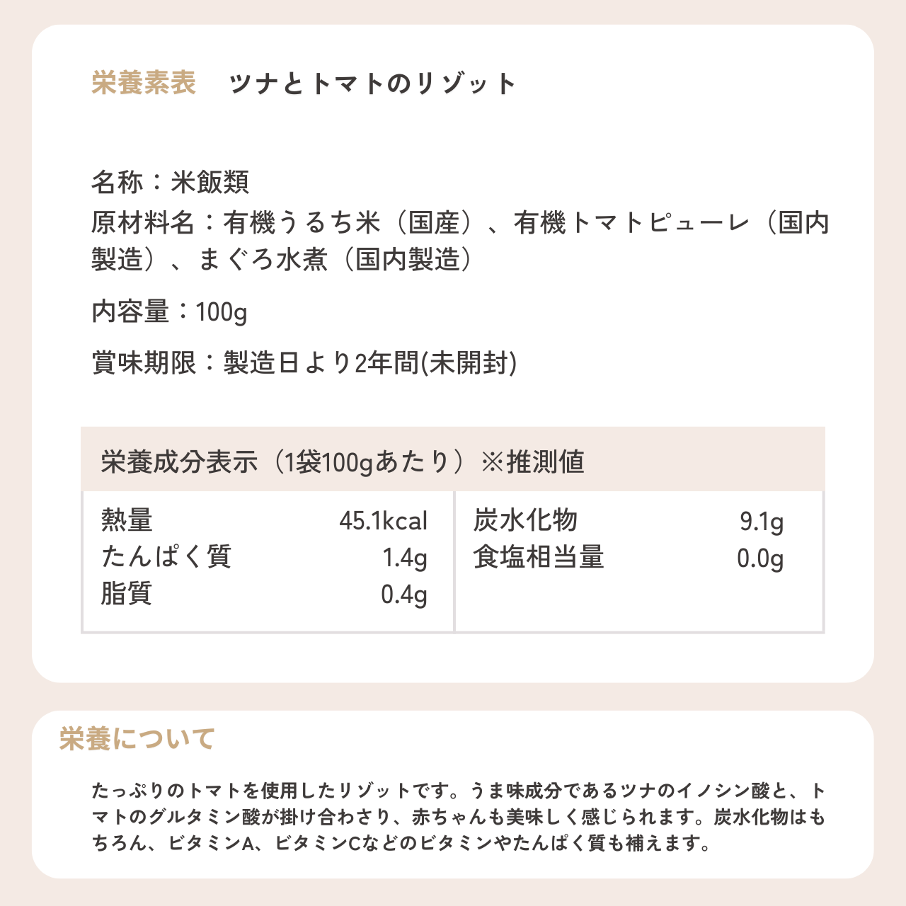 原材料名:有機うるち米(国産)、まぐろ水煮(国内製造)、有機トマトピューレ(国内製造)