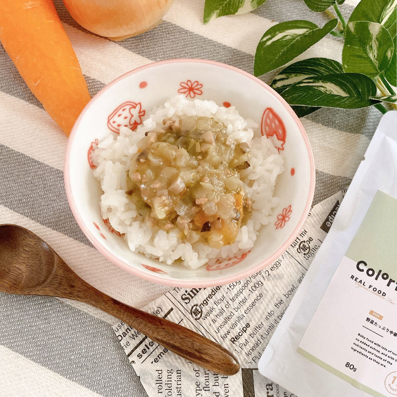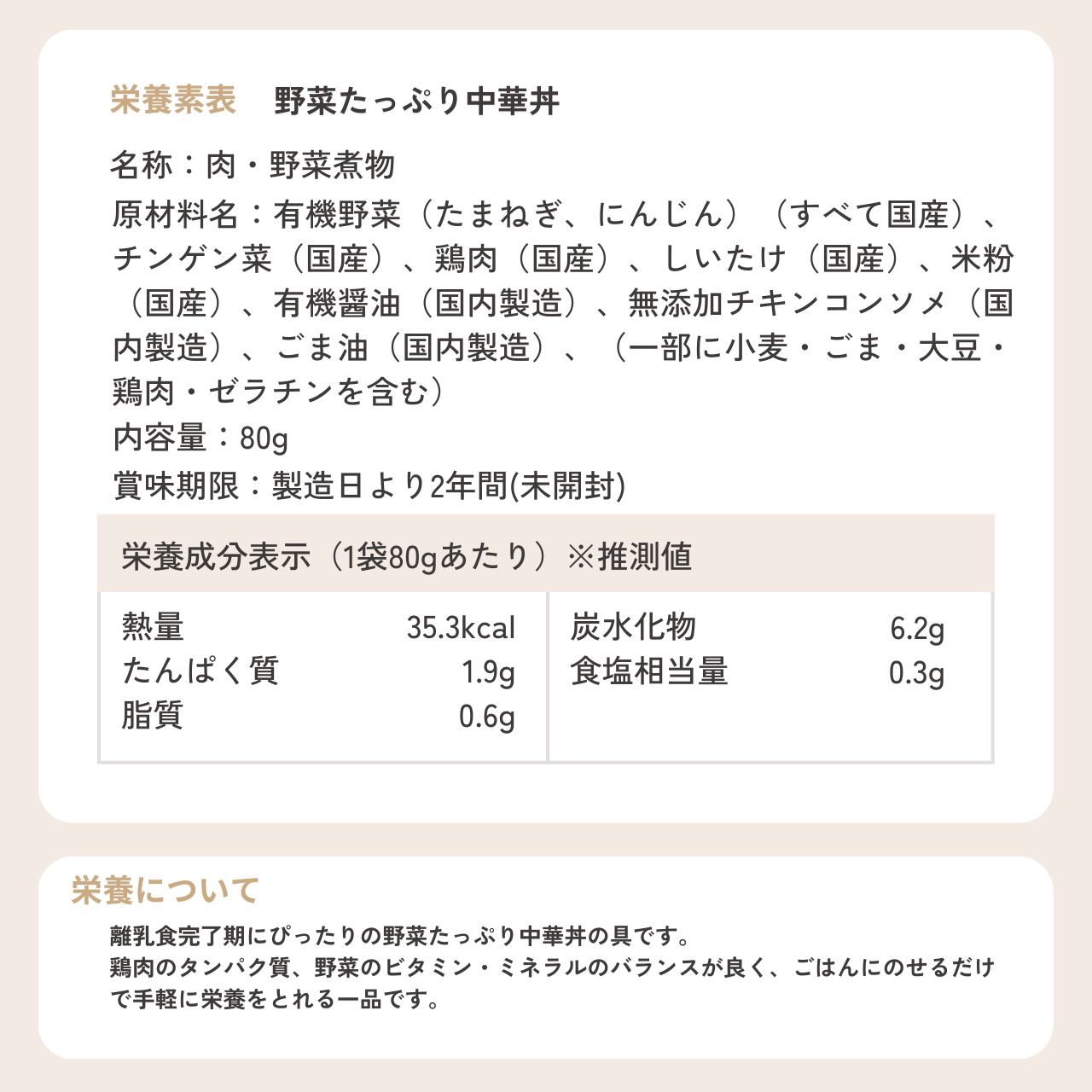 原材料名::有機たまねぎ(国産)、有機にんじん(国産)、チンゲン菜(国産)、鶏肉(国産)、しいたけ(国産)、米粉(国産)、有機醤油(国内製造)、無添加チキンコンソメ(国内製造)、ごま油(国内製造)(一部に小麦・ごま・大豆・鶏肉・ゼラチンを含む)